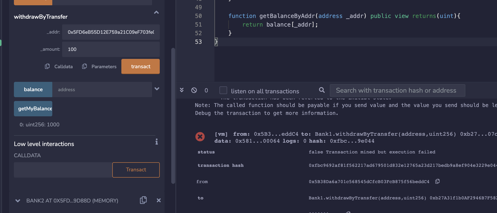 Bank1에서 Bank2 CA 주소로 100wei 만큼 전송 했지만 실패한 부분을 확인할수 있다. 3. Bank2 contract에 fallback 과 receive 함수를 넣어보고 다시 보내 보았다.